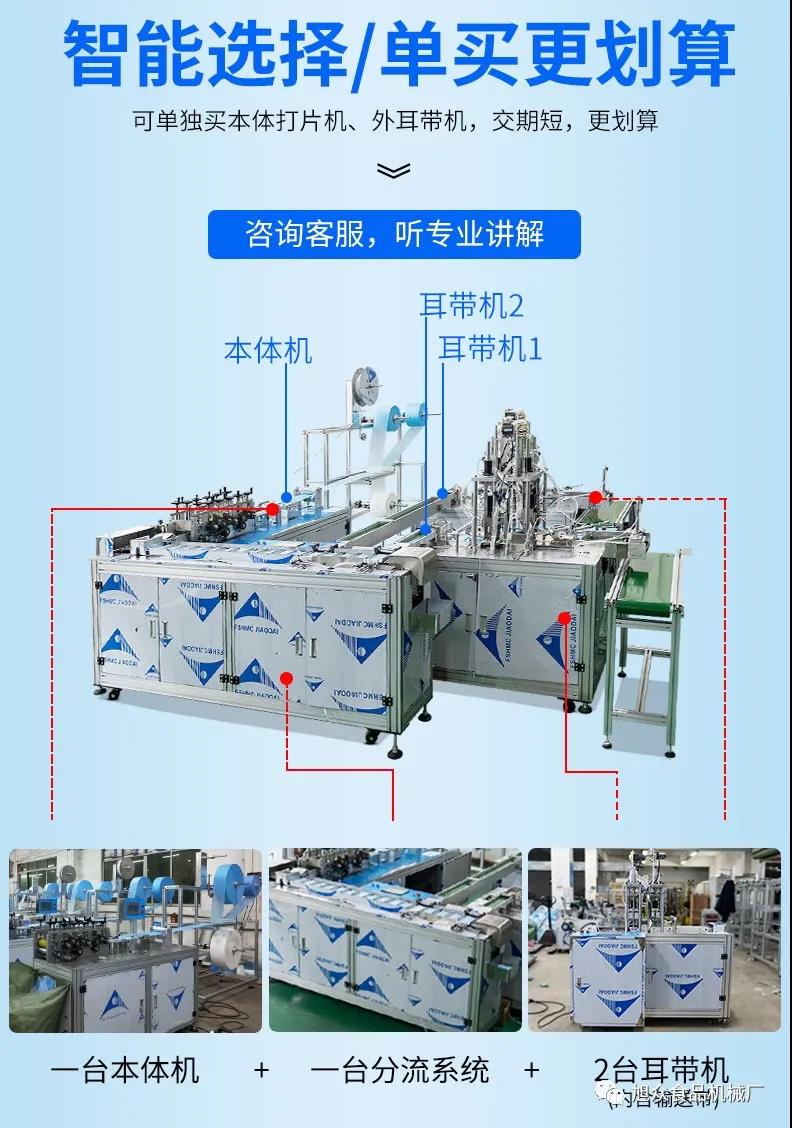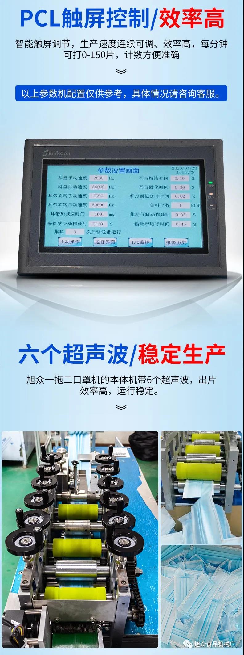 旭眾牌一拖二口罩機由一臺本體機帶動兩臺耳帶機組成。本體機輸出ロ罩本體后,由輸送帶結(jié)構(gòu)將口罩本體片輸送到連接耳帶機的輸送帶上,再通過輸送帶將口罩片輸送到耳帶機的正面第一個口罩盤上方,最后通過氣缸下壓把口罩片放置到耳帶機的口罩盤內(nèi),后續(xù)由耳帶機完成口罩的耳帶熔接,包邊等動作,從而完成一個耳帶口罩產(chǎn)品的生產(chǎn)。本機采用PLC、觸摸屏控制、主傳送帶采用單相馬達輸送、步進馬達翻轉(zhuǎn),傳動精確,控制穩(wěn)定,速度可調(diào)。