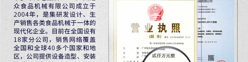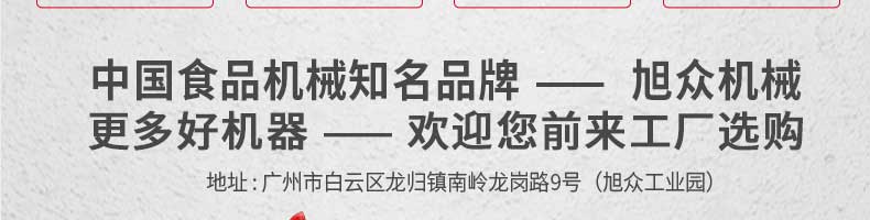 廣州旭眾食品機(jī)械有限公司是一家集科研開(kāi)發(fā),生產(chǎn)設(shè)計(jì),營(yíng)銷服務(wù)為一體的現(xiàn)代化生產(chǎn)企業(yè)?,F(xiàn)代化生產(chǎn)車(chē)間,精湛制造技術(shù),所產(chǎn)機(jī)械歷經(jīng)市場(chǎng)重重考驗(yàn),不斷贏得海內(nèi)外客戶的贊譽(yù)。