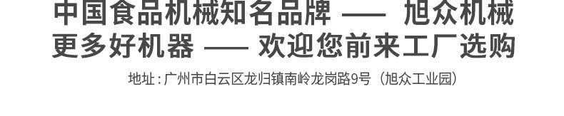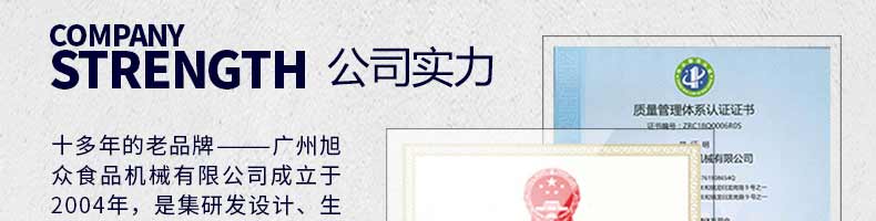 廣州旭眾食品機(jī)械有限公司是一家集科研開發(fā),生產(chǎn)設(shè)計,營銷服務(wù)為一體的現(xiàn)代化生產(chǎn)企業(yè)?,F(xiàn)代化生產(chǎn)車間,精湛制造技術(shù),所產(chǎn)機(jī)械歷經(jīng)市場重重考驗,不斷贏得海內(nèi)外客戶的贊譽(yù)。