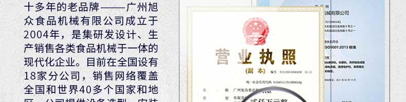 廣州旭眾食品機(jī)械有限公司是一家集科研開發(fā),生產(chǎn)設(shè)計,營銷服務(wù)為一體的現(xiàn)代化生產(chǎn)企業(yè)?,F(xiàn)代化生產(chǎn)車間,精湛制造技術(shù),所產(chǎn)機(jī)械歷經(jīng)市場重重考驗,不斷贏得海內(nèi)外客戶的贊譽(yù)。