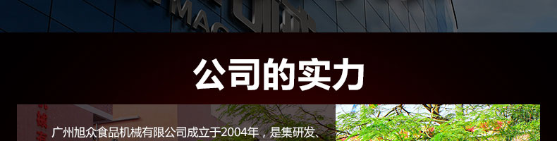 廣州旭眾食品機(jī)械有限公司是一家集科研開發(fā),生產(chǎn)設(shè)計(jì),營(yíng)銷服務(wù)為一體的現(xiàn)代化生產(chǎn)企業(yè)?,F(xiàn)代化生產(chǎn)車間,精湛制造技術(shù),所產(chǎn)機(jī)械歷經(jīng)市場(chǎng)重重考驗(yàn),不斷贏得海內(nèi)外客戶的贊譽(yù)。