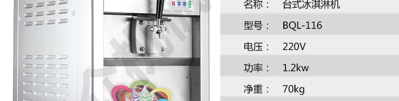 BQL-116臺式冰淇淋機,●選用國際名牌成熟制冷配套件和高效壓縮機,融合旭眾精湛工藝輔以嚴格的質(zhì)量控制流程,使產(chǎn)品整體性能及品質(zhì)得以全面提升。●采用全數(shù)字電腦控制系統(tǒng),選用名牌優(yōu)質(zhì)電器元件,先進的生產(chǎn)工藝,故障診斷,軟硬任意調(diào)制,自動修復功能,安全精確,可靠性更高。●專業(yè)成熟制冷系統(tǒng)設計,選用世界名牌大功率專用壓縮機,大大縮短冰淇淋成型時間,相同時間內(nèi)冰淇淋產(chǎn)量大幅度增加,使您生意火爆時依然得心應手,為您創(chuàng)造財富?!癜踩椒€(wěn)的機械攪拌系統(tǒng),噪音更低、振動更小,使整機運行性能達到國際先進水平?!翊_保進料溫度在0°C~35°C;環(huán)境溫度5°C~40°C勻可正常使用。