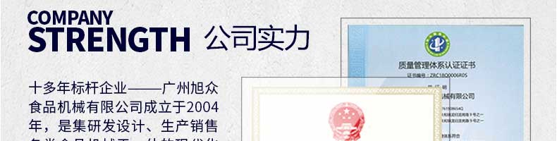 廣州旭眾食品機(jī)械有限公司是一家集科研開(kāi)發(fā),生產(chǎn)設(shè)計(jì),營(yíng)銷服務(wù)為一體的現(xiàn)代化生產(chǎn)企業(yè)。現(xiàn)代化生產(chǎn)車間,精湛制造技術(shù),所產(chǎn)機(jī)械歷經(jīng)市場(chǎng)重重考驗(yàn),不斷贏得海內(nèi)外客戶的贊譽(yù)。