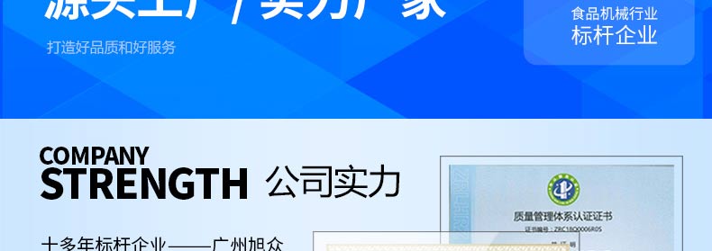 廣州旭眾食品機械有限公司是一家集科研開發(fā),生產(chǎn)設(shè)計,營銷服務(wù)為一體的現(xiàn)代化生產(chǎn)企業(yè)?,F(xiàn)代化生產(chǎn)車間,精湛制造技術(shù),所產(chǎn)機械歷經(jīng)市場重重考驗,不斷贏得海內(nèi)外客戶的贊譽。