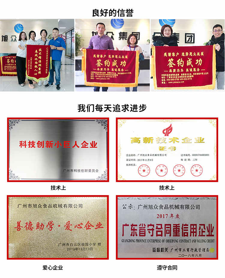 廣州旭眾食品機(jī)械有限公司是一家集科研開發(fā),生產(chǎn)設(shè)計(jì),營(yíng)銷服務(wù)為一體的現(xiàn)代化生產(chǎn)企業(yè)?,F(xiàn)代化生產(chǎn)車間,精湛制造技術(shù),所產(chǎn)機(jī)械歷經(jīng)市場(chǎng)重重考驗(yàn),不斷贏得海內(nèi)外客戶的贊譽(yù)。