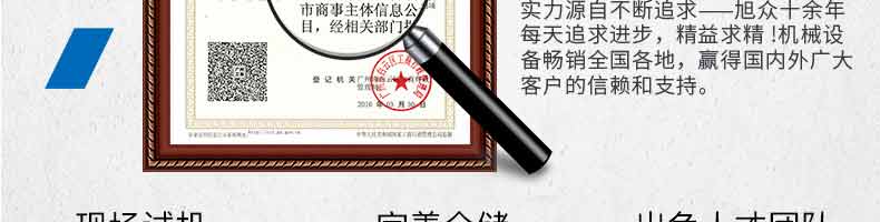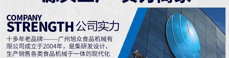 廣州旭眾食品機(jī)械有限公司是一家集科研開(kāi)發(fā),生產(chǎn)設(shè)計(jì),營(yíng)銷服務(wù)為一體的現(xiàn)代化生產(chǎn)企業(yè)?,F(xiàn)代化生產(chǎn)車間,精湛制造技術(shù),所產(chǎn)機(jī)械歷經(jīng)市場(chǎng)重重考驗(yàn),不斷贏得海內(nèi)外客戶的贊譽(yù)。