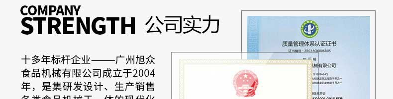 廣州旭眾食品機械有限公司是一家集科研開發(fā),生產(chǎn)設(shè)計,營銷服務為一體的現(xiàn)代化生產(chǎn)企業(yè)?,F(xiàn)代化生產(chǎn)車間,精湛制造技術(shù),所產(chǎn)機械歷經(jīng)市場重重考驗,不斷贏得海內(nèi)外客戶的贊譽。
