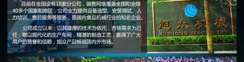 廣州旭眾食品機(jī)械有限公司是一家集科研開發(fā),生產(chǎn)設(shè)計,營銷服務(wù)為一體的現(xiàn)代化生產(chǎn)企業(yè)?,F(xiàn)代化生產(chǎn)車間,精湛制造技術(shù),所產(chǎn)機(jī)械歷經(jīng)市場重重考驗,不斷贏得海內(nèi)外客戶的贊譽。