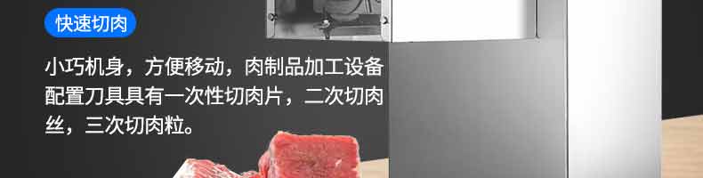 XZ-QX320-切肉機(jī),小型切肉機(jī)是一款主要對肉類進(jìn)行加工的設(shè)備,配置單層刀具一次性切肉片,二次切肉絲,再切成料。刀具采取外置懸臂式設(shè)計,拆洗方便,衛(wèi)生更有保障;配置多種刀具,可加工不同厚度的肉片,實(shí)現(xiàn)一機(jī)多用;機(jī)內(nèi)裝有安全保護(hù)開頭,刀具外露時,機(jī)器自鎖不能啟動,以保安全;卸下的刀具,不用清洗直接放置在6攝氏度以下的冰箱里,刀具余肉不發(fā)臭。刀片用特殊不銹鋼材料制造,經(jīng)久耐用。