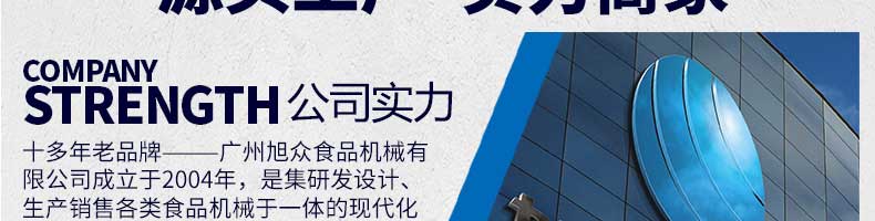 廣州旭眾食品機械有限公司是一家集科研開發(fā),生產(chǎn)設(shè)計,營銷服務(wù)為一體的現(xiàn)代化生產(chǎn)企業(yè)。現(xiàn)代化生產(chǎn)車間,精湛制造技術(shù),所產(chǎn)機械歷經(jīng)市場重重考驗,不斷贏得海內(nèi)外客戶的贊譽。