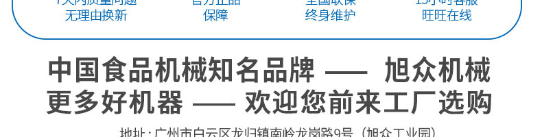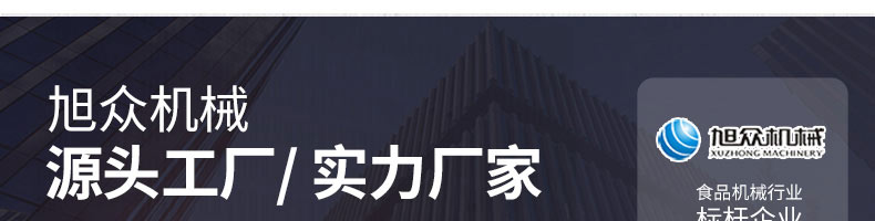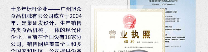 廣州旭眾食品機(jī)械有限公司是一家集科研開發(fā),生產(chǎn)設(shè)計,營銷服務(wù)為一體的現(xiàn)代化生產(chǎn)企業(yè)。現(xiàn)代化生產(chǎn)車間,精湛制造技術(shù),所產(chǎn)機(jī)械歷經(jīng)市場重重考驗,不斷贏得海內(nèi)外客戶的贊譽(yù)。