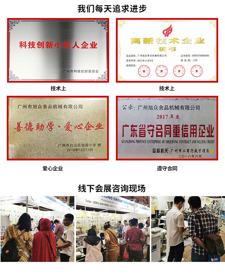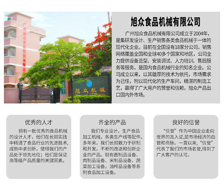 廣州旭眾食品機械有限公司是一家集科研開發(fā),生產設計,營銷服務為一體的現(xiàn)代化生產企業(yè)。現(xiàn)代化生產車間,精湛制造技術,所產機械歷經市場重重考驗,不斷贏得海內外客戶的贊譽。