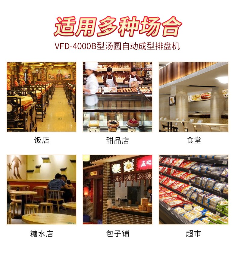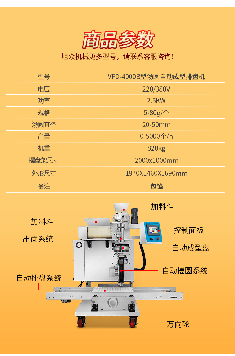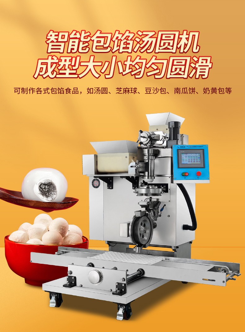 今天給大家介紹一下這款VFD-4000B型湯圓機(jī),為什么要介紹它呢,這款機(jī)械制作多品種食品,關(guān)鍵是產(chǎn)量效率高,1小時的產(chǎn)量可達(dá)5000個,相當(dāng)于20-30個工人同時手工制作湯圓,真正的低投入,高收益,省錢省工,可制作各式包餡食品,如湯圓、豆沙包、南瓜餅等,是賓館、飯店、企業(yè)、學(xué)校、部隊等公共食堂和專業(yè)戶理想的面食機(jī)械。