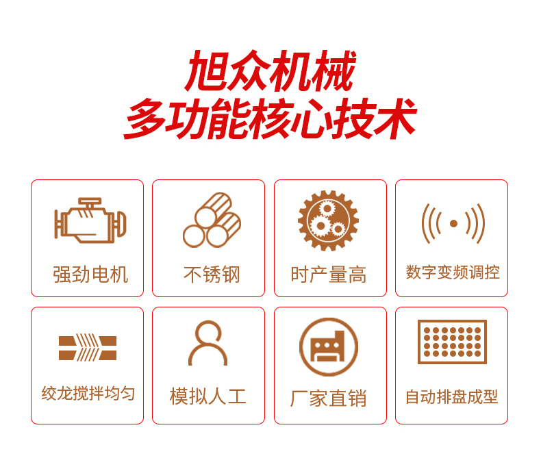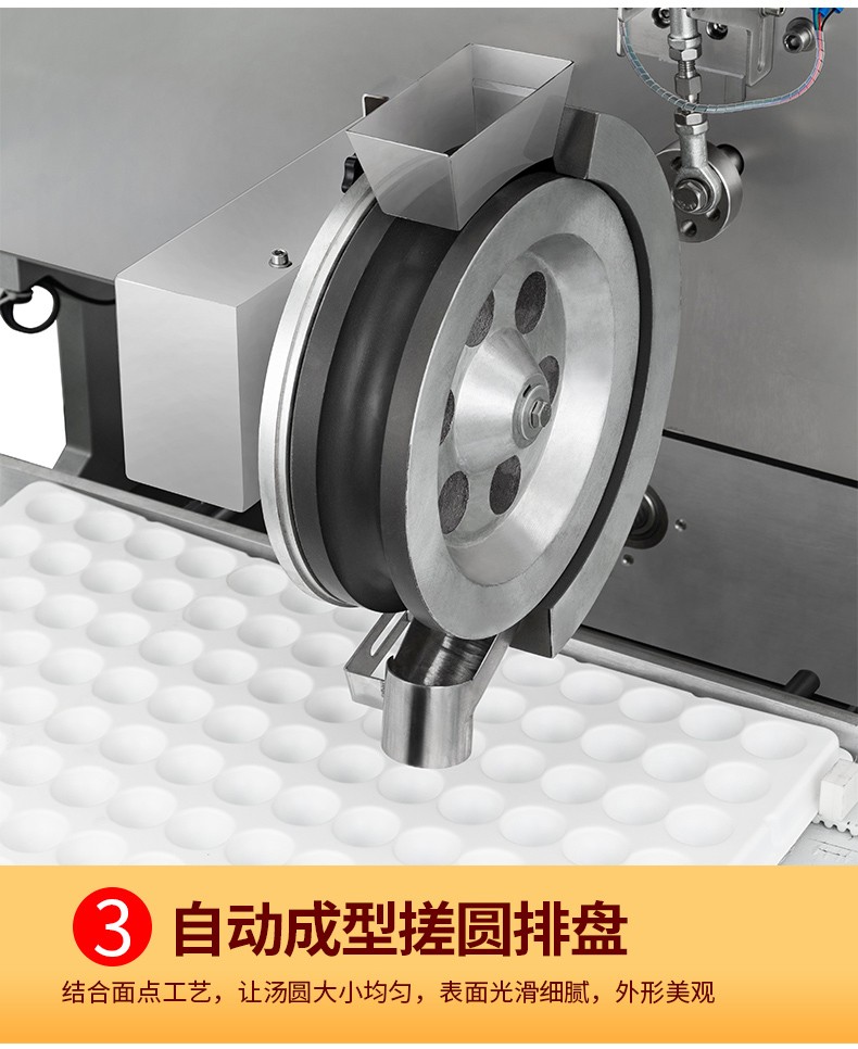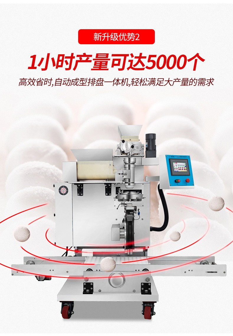 ◆觸摸屏自動控制搓圓擺盤一體成型技術(shù),使得制品外形美觀,大小均勻,表面光亮細(xì)膩、口感柔滑,彈韌性佳。