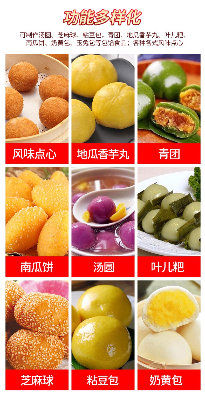 可依外皮及餡料的種類不同,可制作湯圓,芝麻球,豆沙包,南瓜餅、奶皇包、含餡饅頭、玉兔包等包餡食品;各種地方風(fēng)味小吃及各式點心。如:東北的粘豆包,江浙滬的青團(tuán),東南部的地瓜丸,香芋丸;西南的葉兒粑等等。