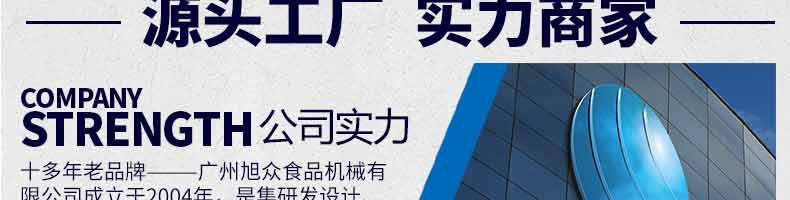 廣州旭眾食品機械有限公司是一家集科研開發(fā),生產(chǎn)設計,營銷服務為一體的現(xiàn)代化生產(chǎn)企業(yè)?,F(xiàn)代化生產(chǎn)車間,精湛制造技術(shù),所產(chǎn)機械歷經(jīng)市場重重考驗,不斷贏得海內(nèi)外客戶的贊譽。