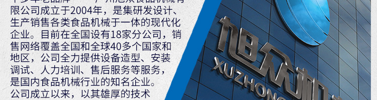 廣州旭眾食品機(jī)械有限公司是一家集科研開發(fā),生產(chǎn)設(shè)計(jì),營(yíng)銷服務(wù)為一體的現(xiàn)代化生產(chǎn)企業(yè)。現(xiàn)代化生產(chǎn)車間,精湛制造技術(shù),所產(chǎn)機(jī)械歷經(jīng)市場(chǎng)重重考驗(yàn),不斷贏得海內(nèi)外客戶的贊譽(yù)。
