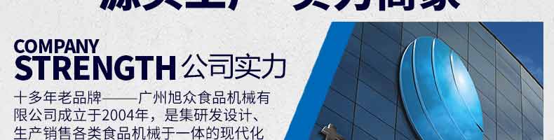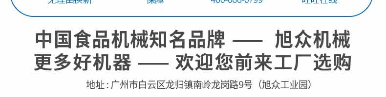 廣州旭眾食品機械有限公司是一家集科研開發(fā),生產設計,營銷服務為一體的現(xiàn)代化生產企業(yè)?,F(xiàn)代化生產車間,精湛制造技術,所產機械歷經市場重重考驗,不斷贏得海內外客戶的贊譽。